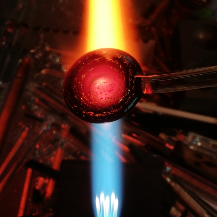 With a high metal content borosilicate glass has a unique colour palette. Silver & gold can also be ‘fumed’ directly in the flame to directly create intense metallic lustres which are then permanently locked into the glass by wrapping clear over them. Fantasy, science, astronomy, and Sci-fi are themes most commonly explored