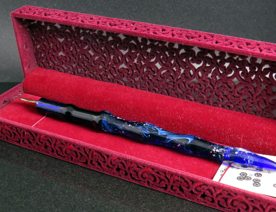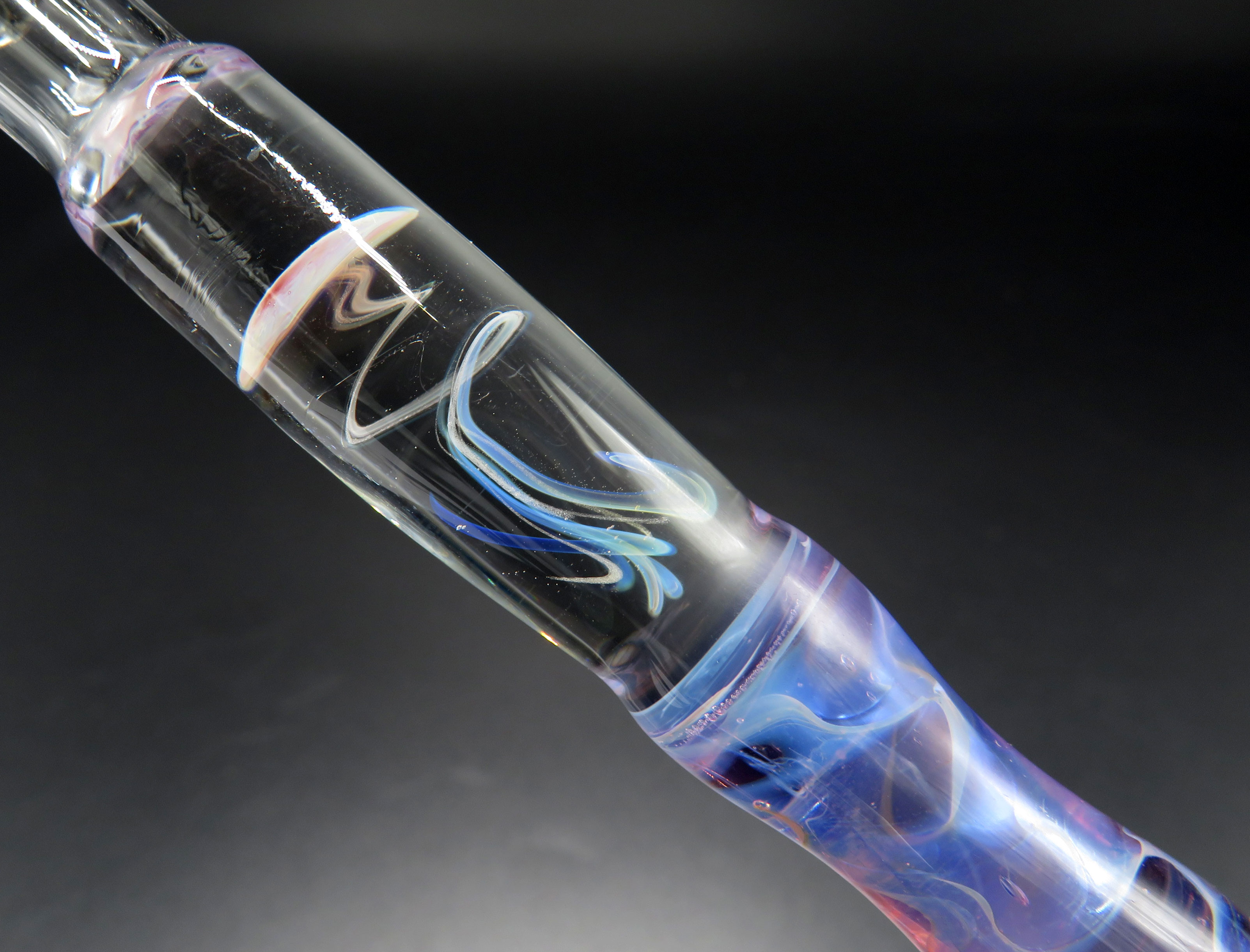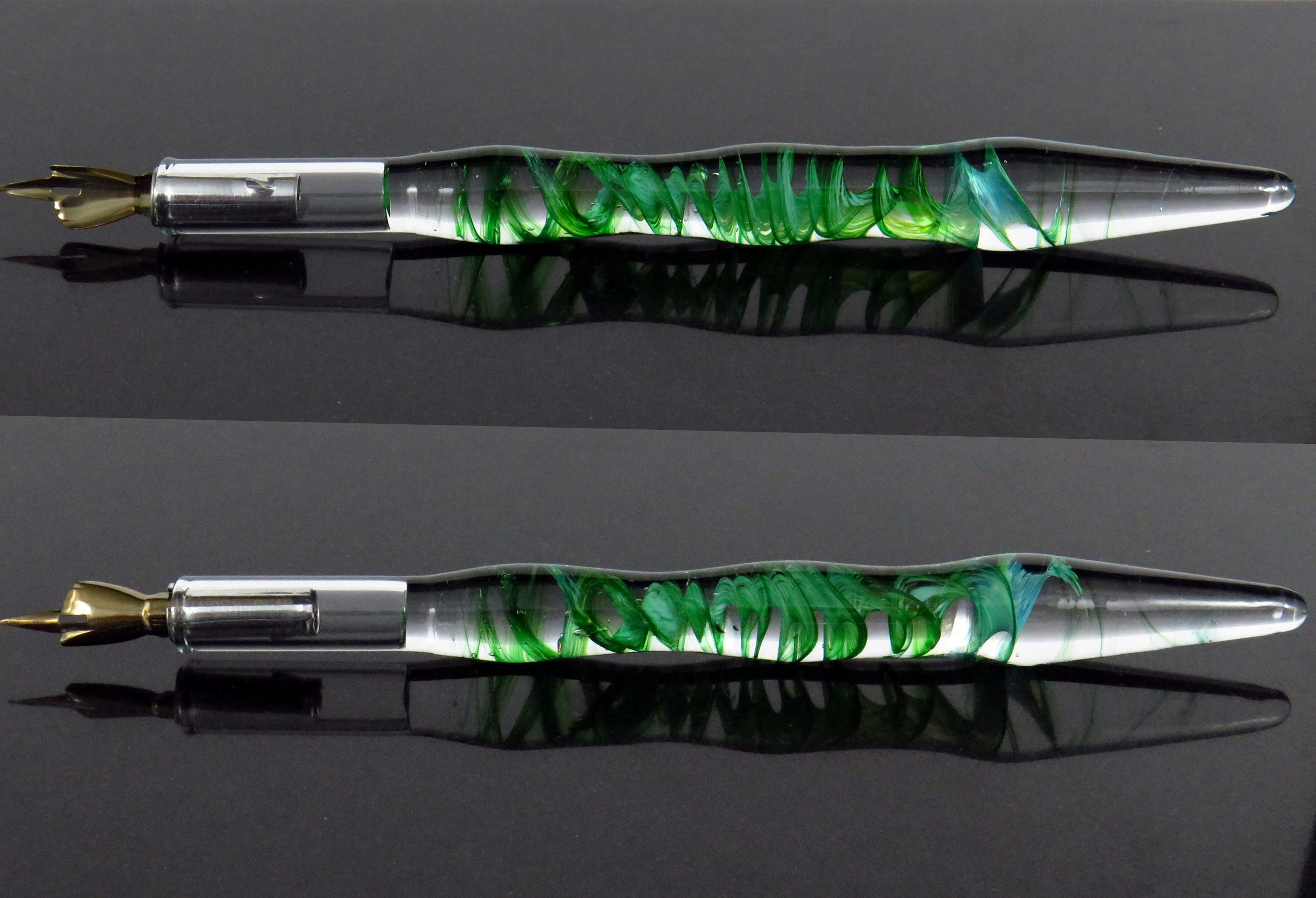 Pens have been a fascinating way of exploring & using the stunning colours available in borosilicate glass. Many feature pure silver, (occasionally 24ct gold too) ‘fumed’ onto the surface which creates unique patterns of lusters & colour directly on the glass, making each totally unique. Made both with interchangable metal nibs, or traditional glass nibs. Ideal as gifts too & often available in the Etsy shop.
