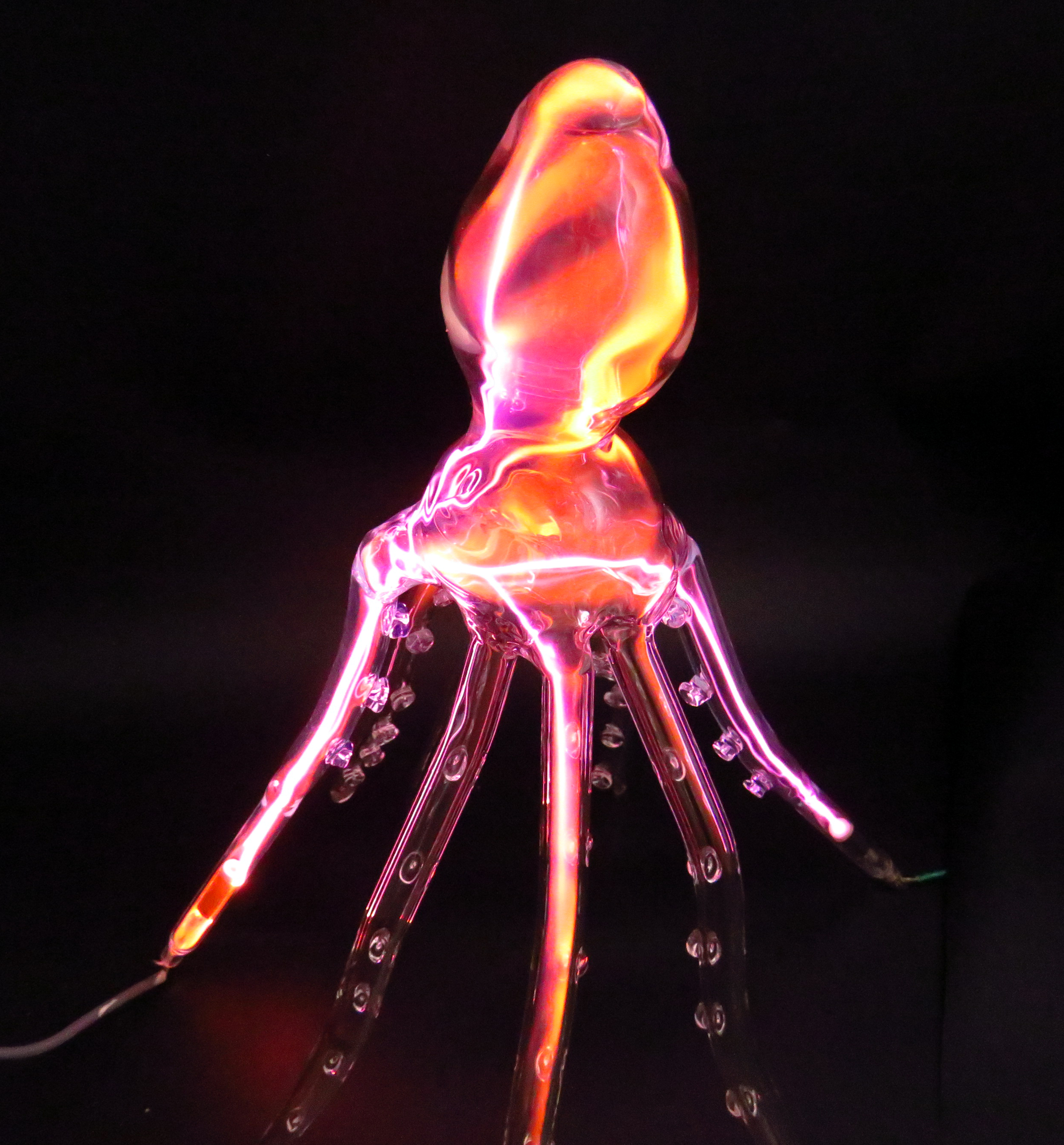 Highly dramatic & experimental, hollow shaped vessels are blown then filled with rare noble gases which are energised by passing high voltages though them. This creates ribbons of light as the gases are ionized which move when the glass is approached or touched. The type of gases change the effects, with lightning effects from Krypton in ‘Storm Summoner’ to colourful oranges and pinks from Neon and Argon in ‘Electric squid’