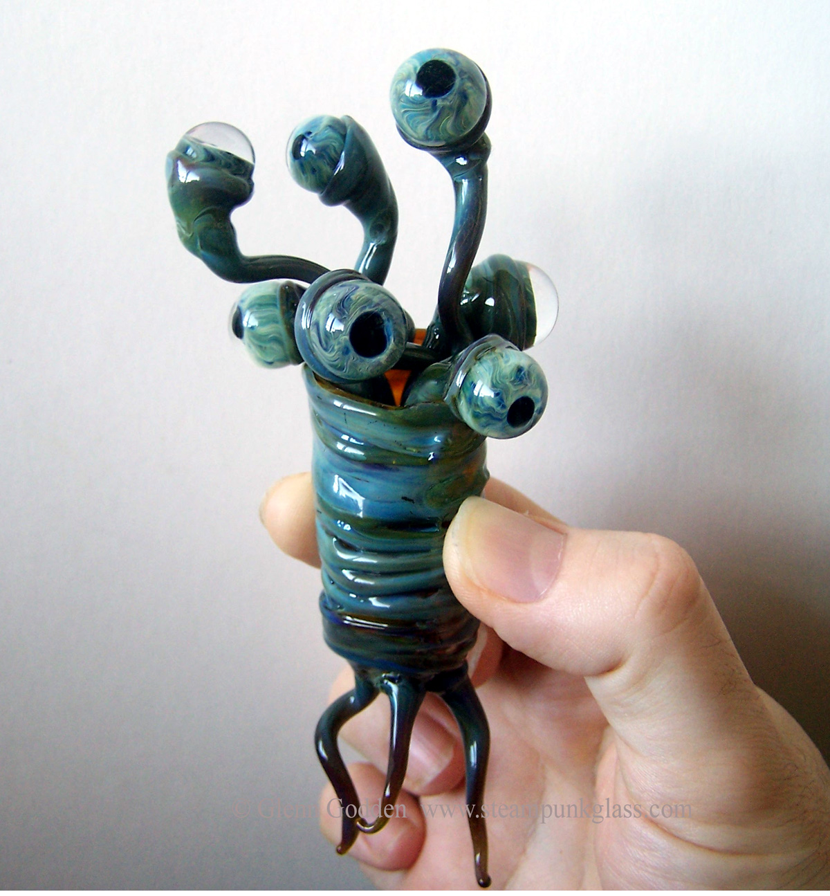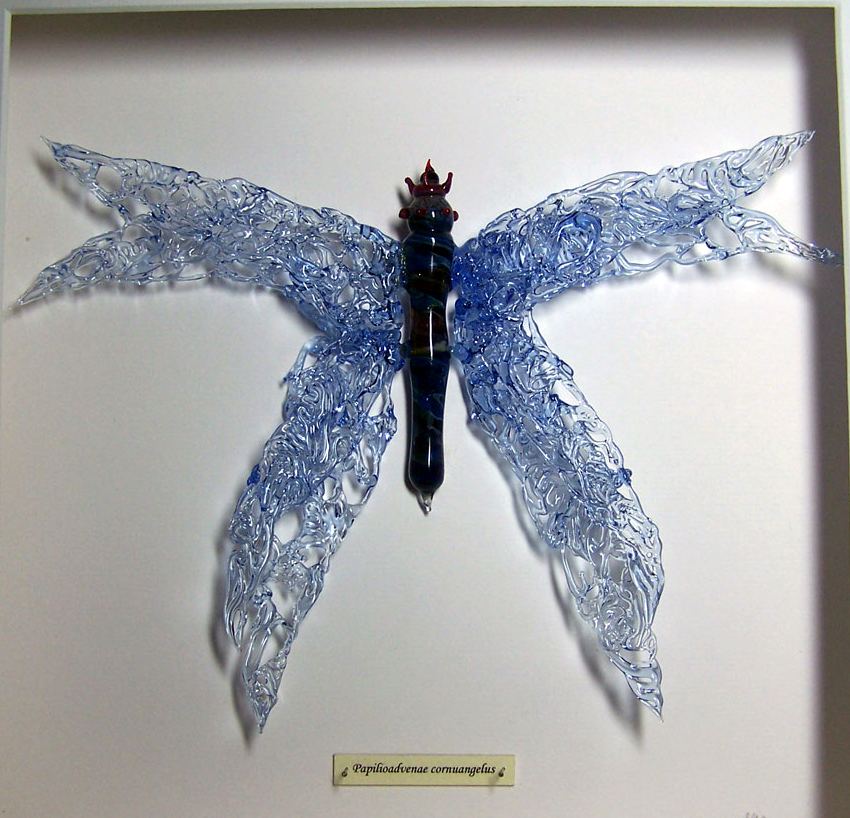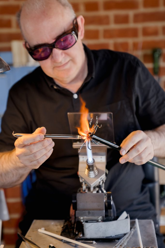 Glenn Godden is a sculptor who specialises in working coloured borosilicate glass using a technique called ‘Lampworking’ or ‘Flameworking’ where glass is directly shaped & manipulated in an oxygen/propane flame to create unique & diverse works ranging from jewellery to large complex sculptures. Borosilicate glass – often known by the ‘Pyrex’ trade-name – has a unique clarity making it ideal for highly complex ‘space-scapes’ inside solid glass. Real 3D effects inside are magnified & the optics create the illusion of depth & distance in marbles that can be held in the hand, complete universes the viewer can escape into.