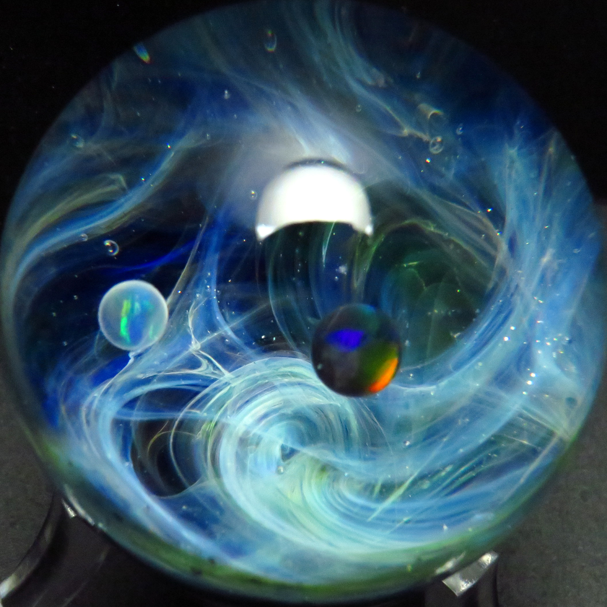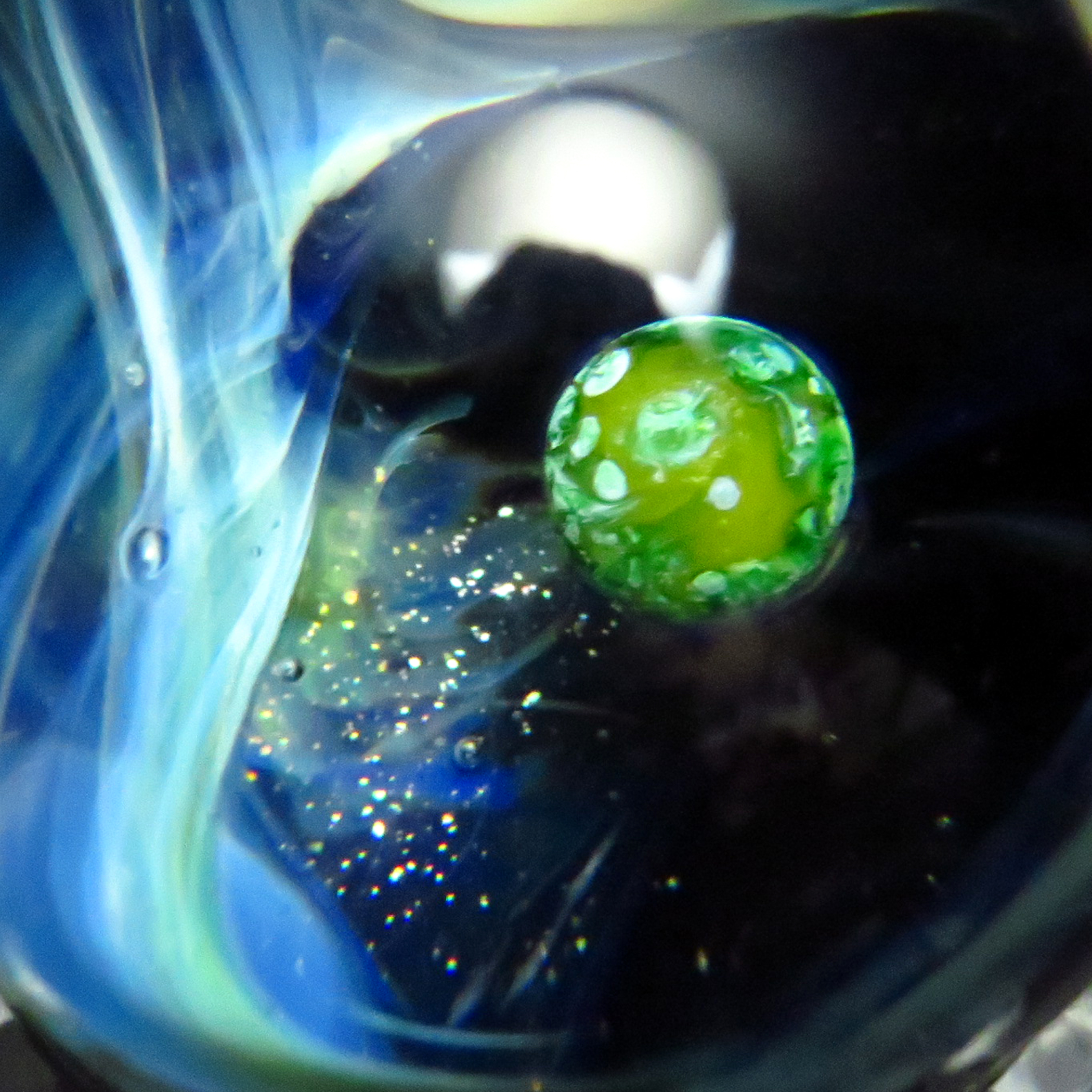 Using the unique optical properties of marbles to create the illusion of depth & distance, these pocket sized universes are a speciality. A galaxy marble was used in the Australian feature film ‘The five Frequencies’ and Glenn was invited to teach & demonstrate making them at the 2015 ‘Flame off’ alongside artists from Russia, USA & France to fellow lampworkers from across UK & Europe.