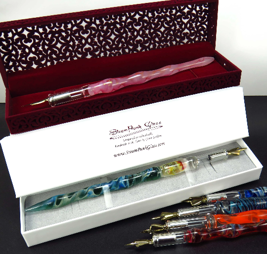 A large range of jewellery, dip pens & other glass can be ordered & shipped worldwide directly at; www.etsy.com/shop/steampunkglass