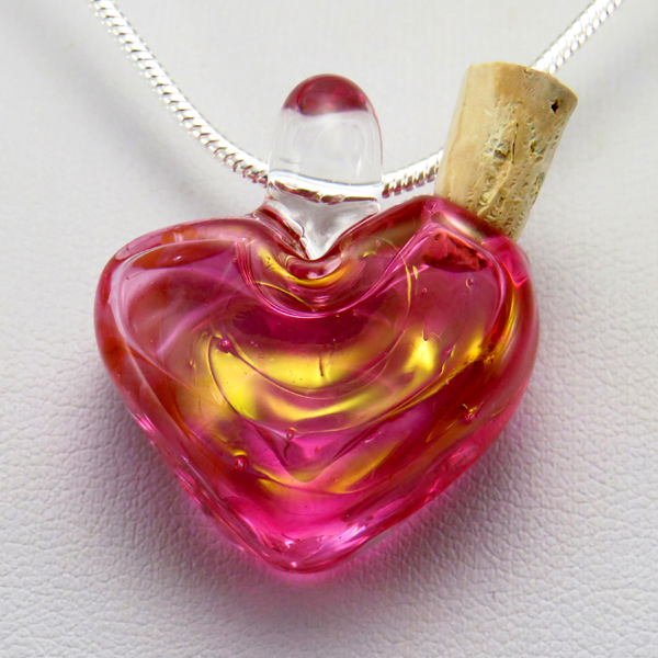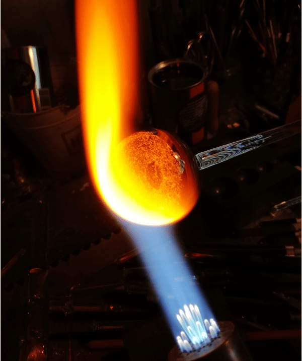 I work primarily with borosilicate glass, which most people know by the ‘Pyrex’ trade name. It has slightly different characteristics than ‘regular’ glass needing a little more heat to melt it. Many of the colours used were not developed until the late 70’s/ early 1980s and have a unique colour palette from the heavy silver and exotic metals used to produce the colours. Most of my clear glass is Simax, which is primarily produced for making scientific laboratory wares so has excellent clarity & quality.