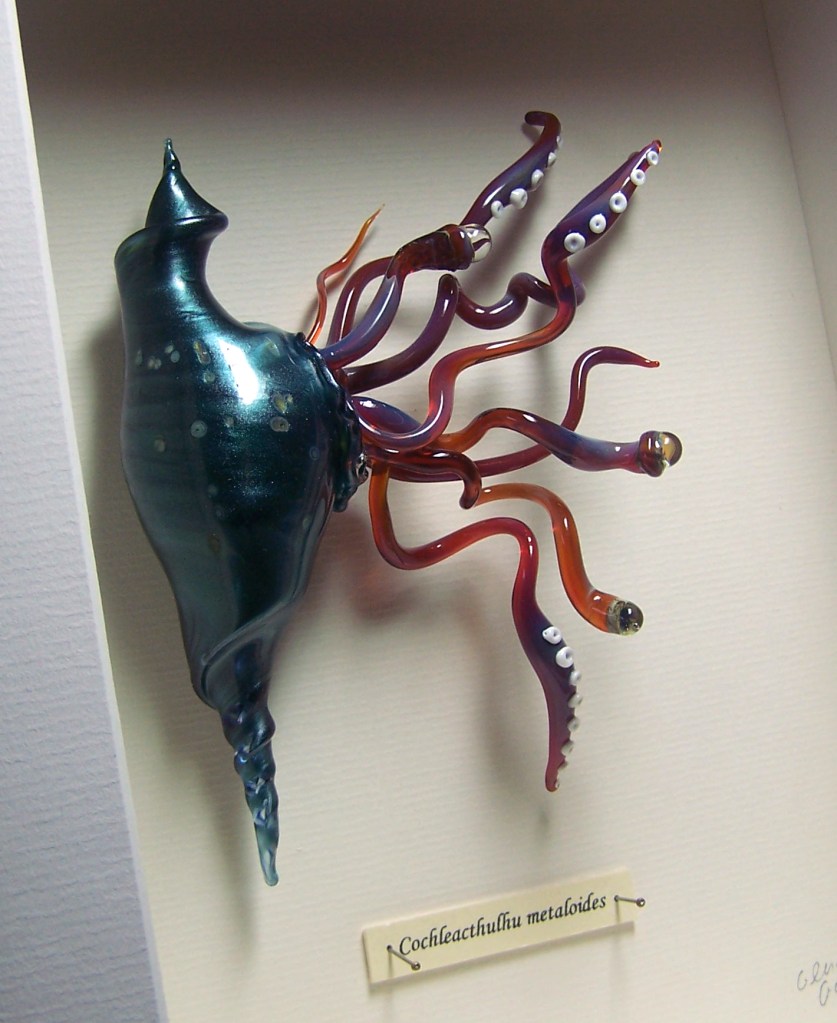 This is by far the most exceptional glasswork I have — and it made it to W.Canada without problem! On my wall, it definitely looks like a specimen …. of some creature … probably not of this world. In the middle of the night, we’re all glad it’s kept safetly locked up in its glass box because at that time of night, my gut sense (that it’s a creature about to move) overrides my rational sense (that it’s ‘just’ an artwork). My cats look at it a little warily too; sometimes I catch them staring at it. In any case, we’ve come to love seeing ‘Clive’ every morning and every night. He’s weirdly adorable…and something of a talisman I think.