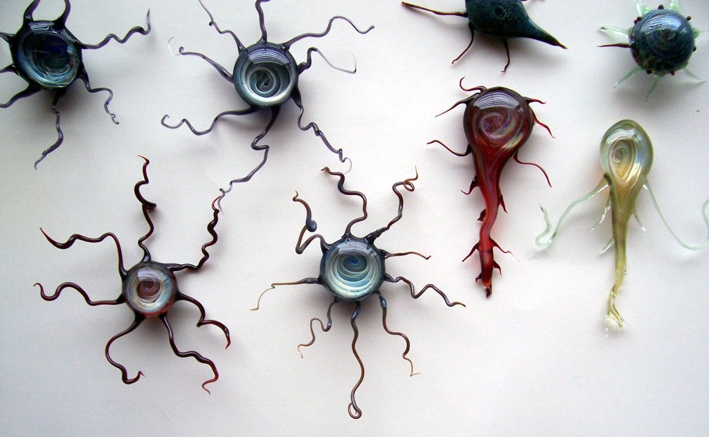 Up until 2016 this was an ongoing project where I created possible lifeforms, in glass, which I then mounted in box frames as though they were scientific specimens. I based them on microscopic creatures, sea-life, & paleontological specimens (especially the precambrian era!) reminding the viewer how rare & strange life on our own planet already is. Sadly alot of the photos of these were lost in a PC crash, these are a few lo-res pictures that I’ve manged to save. Ironically just after I created the ‘bucket of eyes’ creature I had to undergo emergency eye surgery, which greatly reduced the amount of work I could do until 2019. Although I’m now exploring new themes, I suspect a few aliens will still appear as I ‘discover’ them, and will return to expand on this project very soon